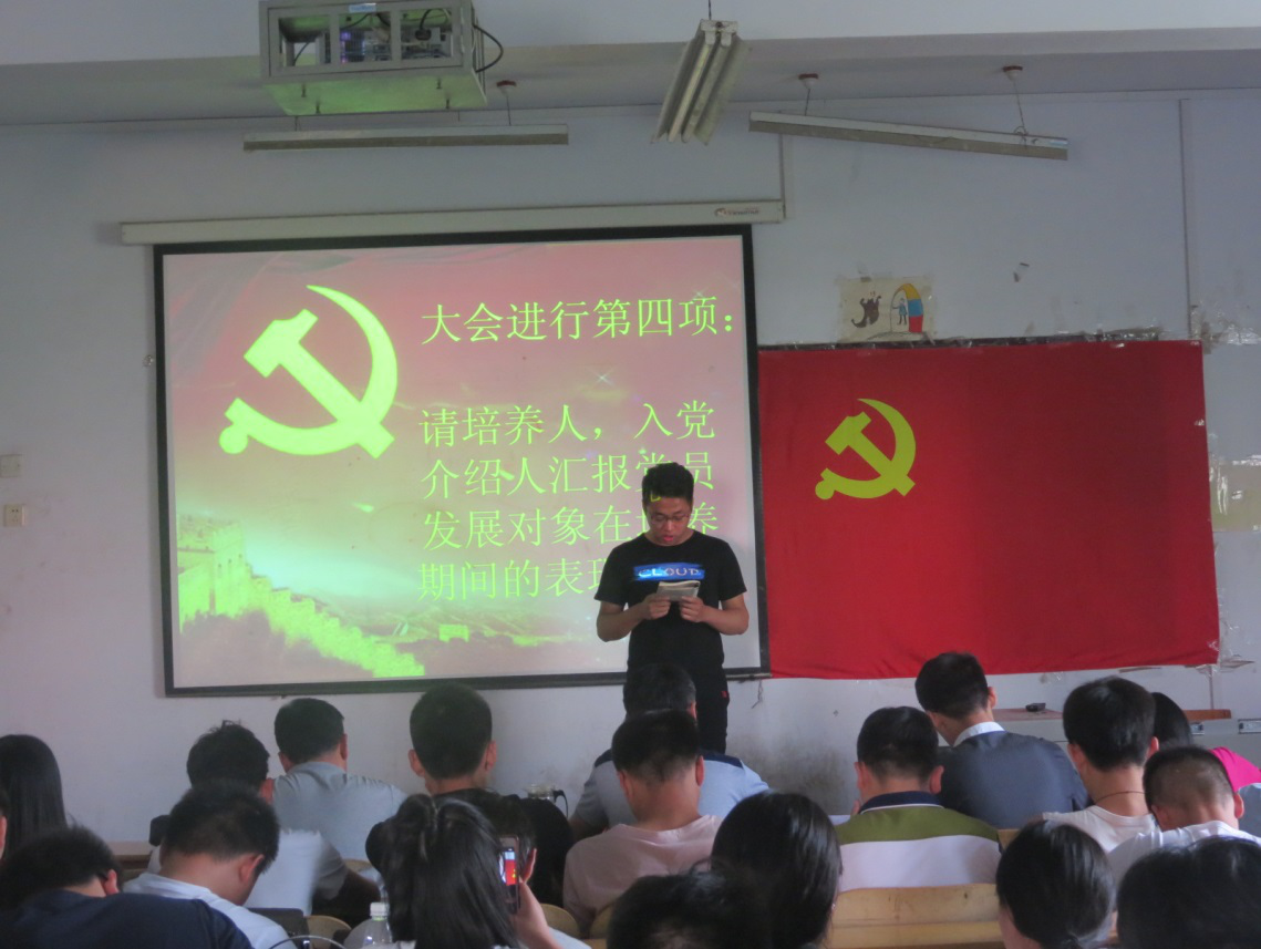 庞博首先宣读了接收预备党员名单,然后预备党员们分别向支部汇报了培养期间的表现,入党培养人和党小组分别汇报了培养期间培养人的表现,经过大会讨论投票,一致同意接收本次24名预备党员。接着进行预备党员转正,预备党员逐一汇报了预备期间的表现,并积极要求按期转正。系各党小组长和入党介绍人汇报了各小组预备党员在预备期间的表现之后,正式党员进行票决。然后马永杰对新接收的预备党员和转正的党员做出要求。要求他们身为党员,要在行动上说到做到,兢兢业业做事,脚踏实地做人,在以后的路程中,重视党员教育,不断的加强学习,不断提升思想认识。最后,新党员在党旗前进行入党宣誓,老党员重温入党誓词。
