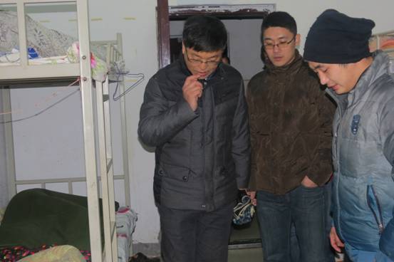 然后,系领导和全体辅导员到立雪楼13级学生宿舍进行查看。看到同学们正在使用电脑,马永杰语重心长地告诫同学们要合理地利用电脑,多学习专业知识,并叮嘱同学们最近天气变化大,一定要注意身体。在学生宿舍中,辅导员与学生亲切交谈,仔细询问宿舍学生返校情况及为返校原因,关心学生假期生活,认真记录学校伙食、宿舍水电等方面存在的问题,鼓励同学们刻苦学习。一句句关心的话语,一个个关心的问候,形成了一幕温情而打动人心的画面,深深印在同学们的心中。