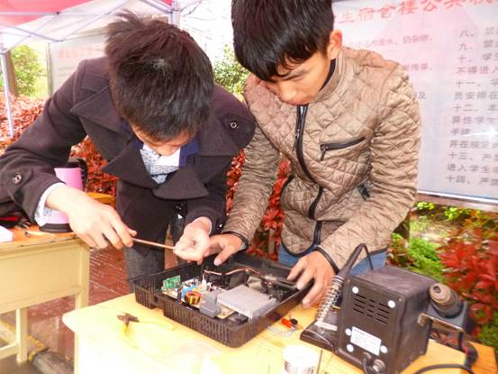 活动现场,协会成员们为老生维修电磁炉、电视机、手电筒、电动玩具等。他们忙碌的身影、专注的神情、熟练的动作和维修后的喜悦,时刻都在散发着机电人的魅力,展示着机电风采。