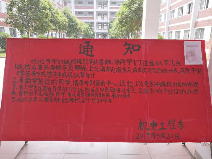 通知:欢迎同学们返校进行毕业答辩!请同学们注意以下几点:1、返校后首先与辅导员联系,上交顶岗实习报告及顶岗实习信息统计表,否则,不安排答辩或答辩成绩以零分计。2、有助学贷款的同学,请及时到资助中心还款,以免影响离校手续的办理。3、有欠学费及其他费用的同学,返校后及时到财务处补交,否则,影响毕业证的办理。4、有科目不及格的同学,请及时与辅导员联系,参加清考。5、返校后要文明答辩,给母校留个好的印象。www.87365.com2017年5月20日