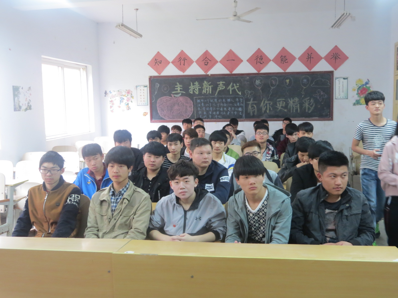 团课上各班团支书也为了响应院广播站号召积极向同学们讲解参加主持人大赛的优点,往小来说可以提高自己的自信心,会使自己的头脑变灵活,知识面得到更大的扩展。往大来说甚至可以让自己终生收益在今后的工作生活中相信同学们一定会遇到很多面试、演讲等等的机会,相信这次的比赛一定是同学们一个很好的锻炼舞台。